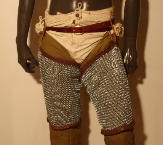 Brynjehoser fastgøres med lædersnøre til et bælte der