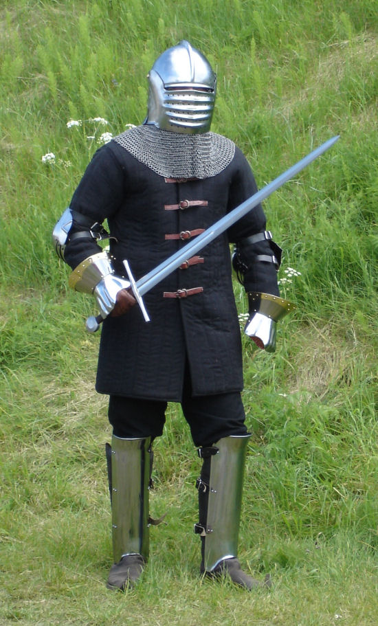 Rustningen er pladebenskinner, -albuer, brynjehætte, en